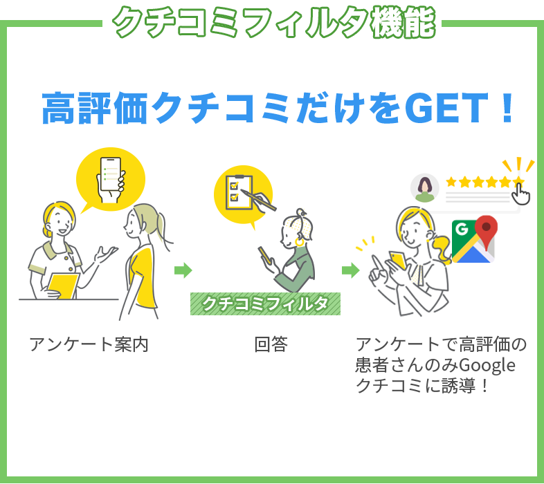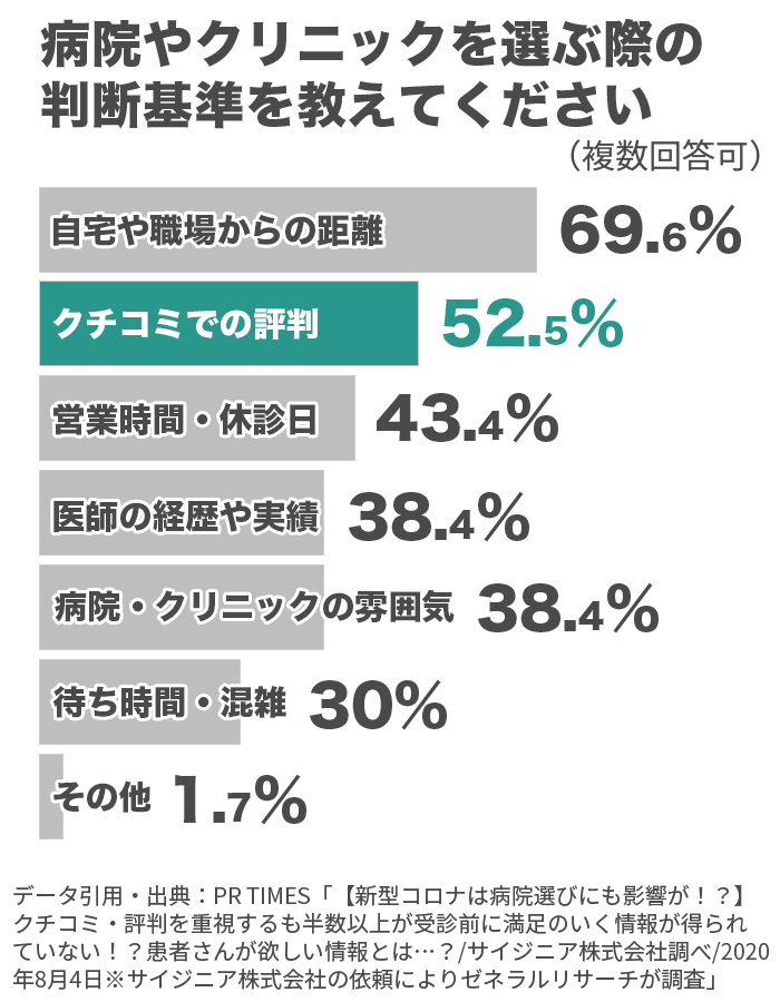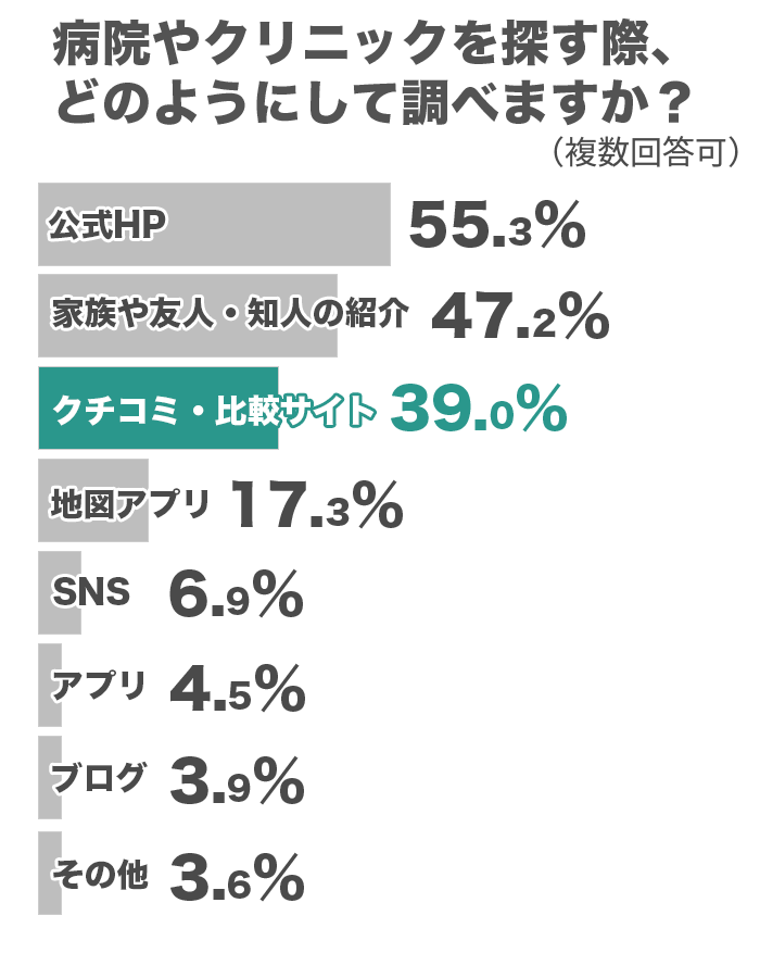 クチコミは他のユーザーからの情報であり、市場調査やマーケティングキャンペーンによって作られたものではない、信頼性が高い情報とされています。ユーザーにとっては、リアルな情報源となるため、クチコミを参考に医院選びをする人が増えています。